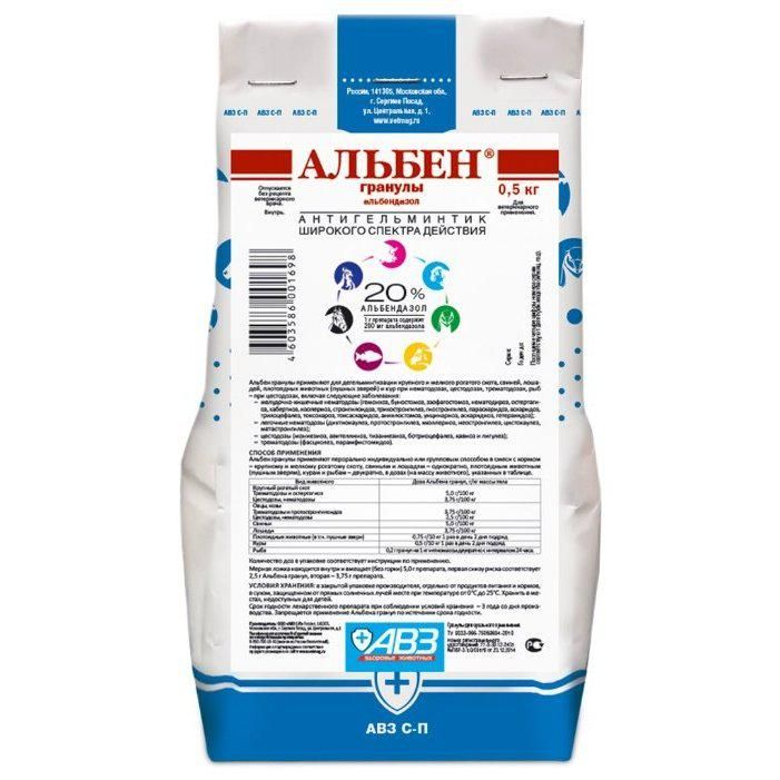 Содержит в качестве действующего вещества альбендазол. Выпускают Альбен гранулы в полимерных банках или ведерках емкостью 1 кг, в пакетах из многослойной бумаги по 0,5 кг. Альбен таблетки – в коробках по 100 штук.