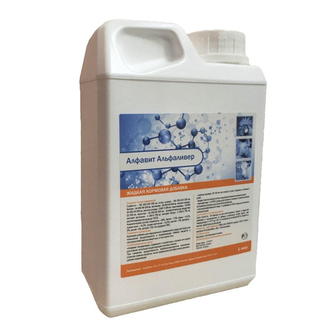 «Алфавит Альфаливер» - отличное решение для Вашего хозяйства. Комплексная кормовая добавка для повышения продуктивности сельскохозяйственных животных и птицы, нормализации обмена веществ и поддержания функций печени (в виде раствора для перорального применения). В 1 л "Алфавит Альфаливер" содержится: сорбитол – 180 000-220 000 мг, холин хлорид - 180 000-220 000 мг, бетаин – 54 000-66 000 мг, метионин – 36 000-44 000 мг, натрия хлорид – 45 000- 55 000 мг, магния хлорид – 2 687-3 284 мг, никотинамид – 18 000 -22 000 мг, карнитин – 45 000-55 000 мг, экстракты растений – артишок, дистиллированная вода до 100%.