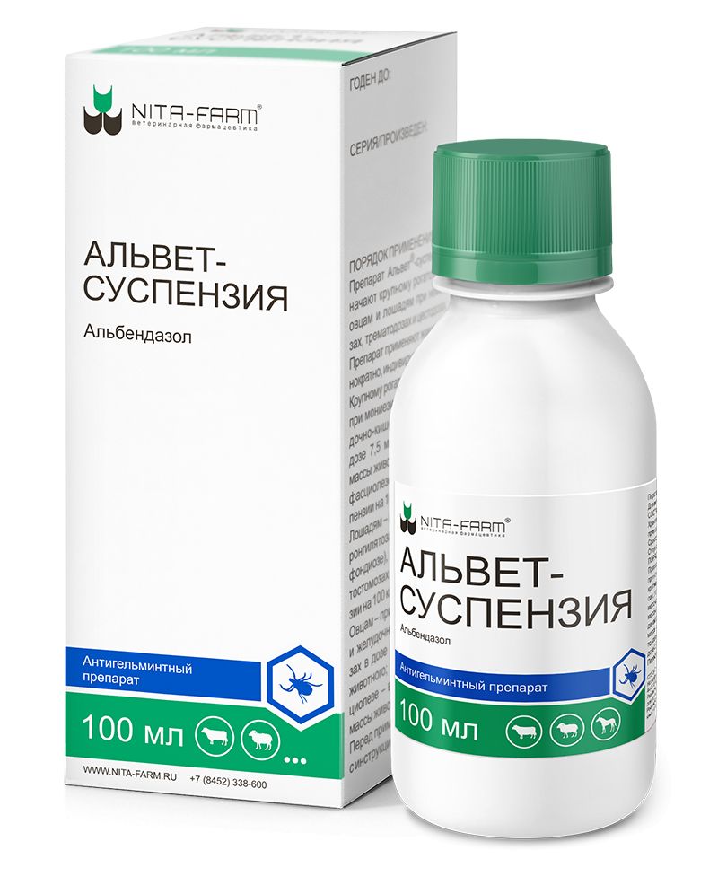 Прекрасное решение для Вашего хозяйства: Альвет суспензия содержит в качестве действующего вещества альбендазол 10% и вспомогательные компоненты (метилцеллюлоза, пропандиол, хлорэтон, кислота лимонная, натрия гидроокись и вода дистиллированная).