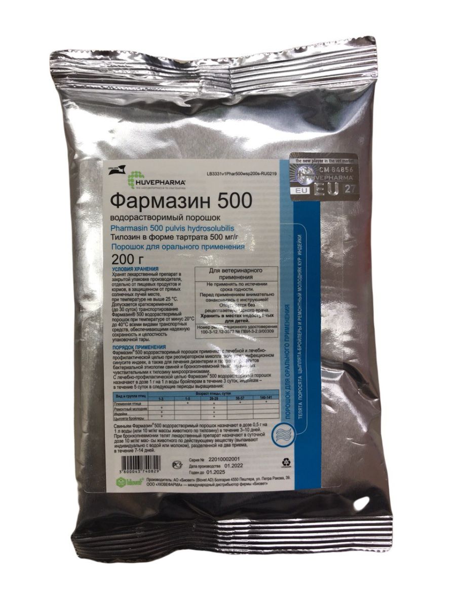 Тилозин — антибиотик из группы макролидов, активен в отношении большинства грамположительных и некоторых грамотрицательных бактерий, в том числе стафилококков, стрептококков, коринебактерий, клостридий, пастерелл, эризипелотриксов, спирохет, хламидий, трепонемы хиодизентерии и микоплазм. При пероральном введении антибиотик хорошо всасывается из желудочно-кишечного тракта и проникает практически во все органы и ткани организма. Наиболее высокий уровень тилозина достигается в легких, печени, молочных железах и почках. Терапевтическая концентрация антибиотика после однократного введения фармазина водорастворимого порошка сохраняется в организме в течение 15 – 18 часов. Кроме этого, благодаря особенностям механизма действия, фармазин избирательно накапливается в тканях с низкими значениями рН, то есть в очагах воспаления, обеспечивая выраженный и целенаправленный эффект. Фармазин проявляет неспецифическое иммуностимулирующее и иммуномодулирующее действие благодаря ингибированию цитокинов, активации плазматических клеток и продукции антител, активации хемотаксиса лейкоцитов и пролиферации лимфоидных элементов. Фармазин в исключительно высоких концентрациях накапливается в лизосомах нейтрофилов, обеспечивая завершенность фагоцитоза и быстрое избавление от бактериальных патогенов. Тилозин выделяется из организма в основном с калом, в меньших количествах — с мочой и молоком, у птиц-несушек — с яйцами.