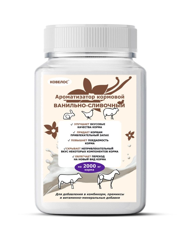 Кормовая добавка в комбикорм ароматизатор Ковелос «Ванильно-сливочный» для повышения поедаемости кормов и увеличения продуктивности всех видов сельскохозяйственных животных и птицы.