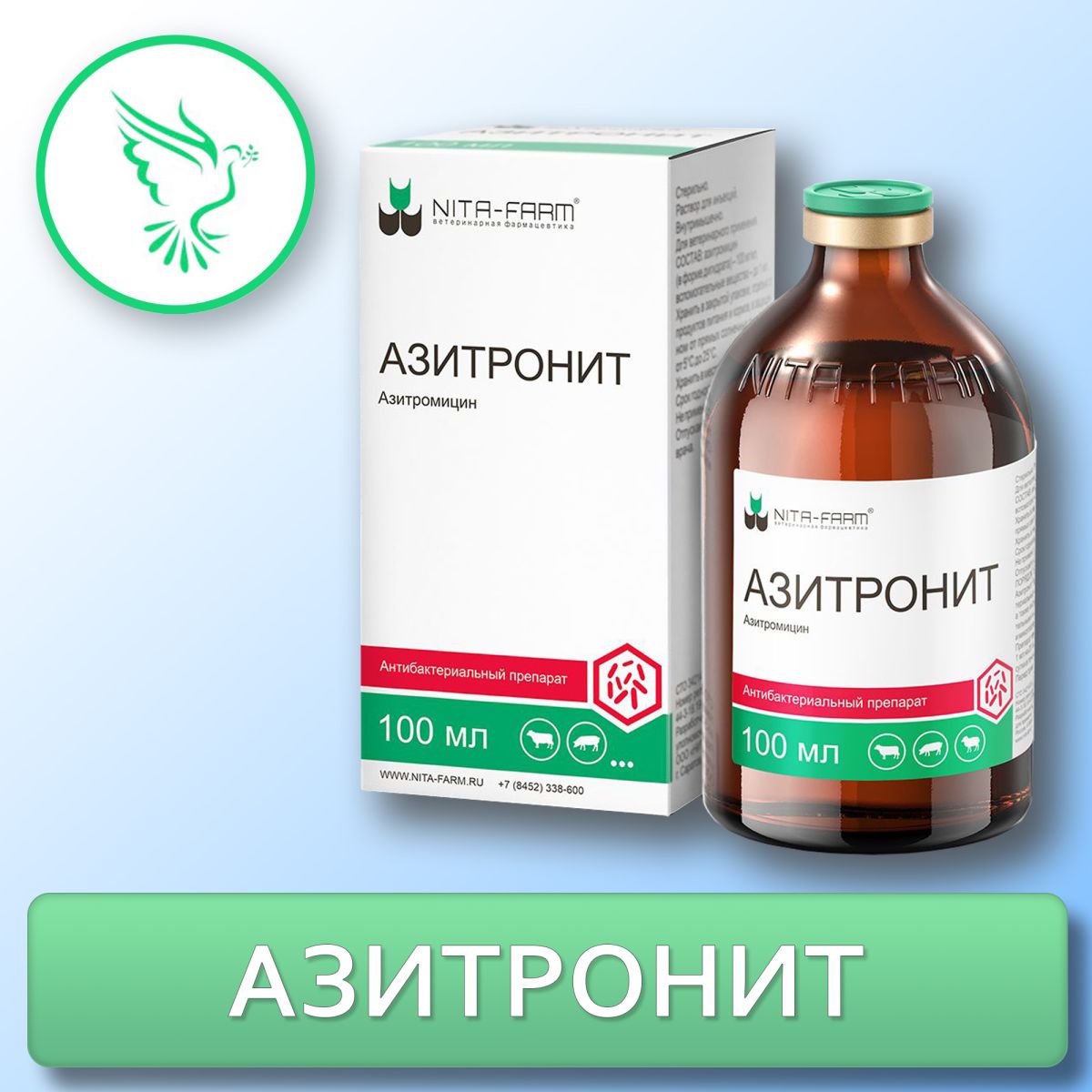 Азитромицин, входящий в состав Азитронита – антибиотик группы макролидов, подгруппы азалидов, широкого спектра действия, оказывающий бактерицидное/бактериостатическое действие на грамотрицательные (Actinobacillus lignieresi, Haemophilus spp, Moraxella spp, Bordetella spp, Campylobacter spp, Legionella pneumophila, Salmonella spp, Escherichia spp) и грамположительные бактерии ((Listeria spp, Staphylococcus aureus, Staphylococcus spp, Streptococcus spp, Streptococcus pneumoniae, Streptococcus pyogenes, Enterococcus faecalis, Erysipelothrix insidiosa и некоторые анаэробные бактерии: (Сlostridium perfringens, Fusobacterium spp), Pasteurella (Mannheimia) haemolytica, Pasteurella multocida, Haemophilus parasuis, микоплазмы (Mycoplasma pneumoniae), Chlamydia pneumoniae, спирохеты (Borrelia spp.). Механизм действия азитромицина связан с торможением биосинтеза белка рибосомами бактерий (нарушается образование пептидных связей между аминокислотами и пептидной цепью). Азитромицин проявляет постантибиотический эффект – персистирующее ингибирование жизнедеятельности бактерий после их кратковременного контакта с антибактериальным препаратом. В основе эффекта лежат необратимые изменения в рибосомах микроорганизма, следствием чего является стойкий блок транслокации. За счет этого общее антибактериальное действие препарата усиливается и пролонгируется, сохраняясь в течение срока, необходимого для ресинтеза новых функциональных белков микробной клетки.