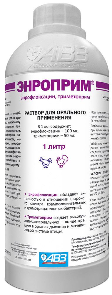 Цыплятам – бройлерам, ремонтному молодняку кур и индейкам с лечебнопрофилактической целью при колибактериозе, сальмонеллезе, хронических респираторных заболеваниях, стрептококкозе, некротическом энтерите, гемофилезе, микоплазмозе, смешанных инфекциях и вторичных инфекциях при вирусных болезнях, возбудители которых чувствительны к энрофлоксацину и триметоприму.