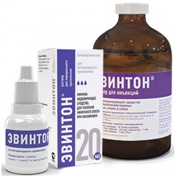 Эвинтон раствор для перорального применения задают животным внутрь индивидуально в дозе 1 капля на 1 кг массы тела животного 2 раза в день в течение 2-3 недель.