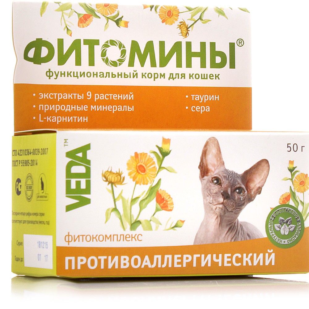Фитомины против аллергии для кошек предназначены для профилактики и в качестве дополнительного симптоматического средства при лечении аллергических реакций – расчесов, мокнущих язв, инфицированных высыпаний, связанных с непереносимостью пищевых компонентов, реакциями на различные бытовые и лекарственные раздражители.
