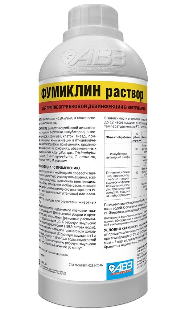 Фумиклин раствор применяют для противогрибковой дезинфекции помещений, подстилки, инкубаторов, выводных шкафов, кормушек, клеток, гнезд, поилок, инженерных коммуникаций в птицеводческих и животноводче ских помещениях, кролиководческих фермах и конюшнях, обсемененных гри бами, включая Aspergillus spp., Trichophyton verrucosum, Т. mentagrophytes, Т. equinum, Microsporum canis, М gypseum.
