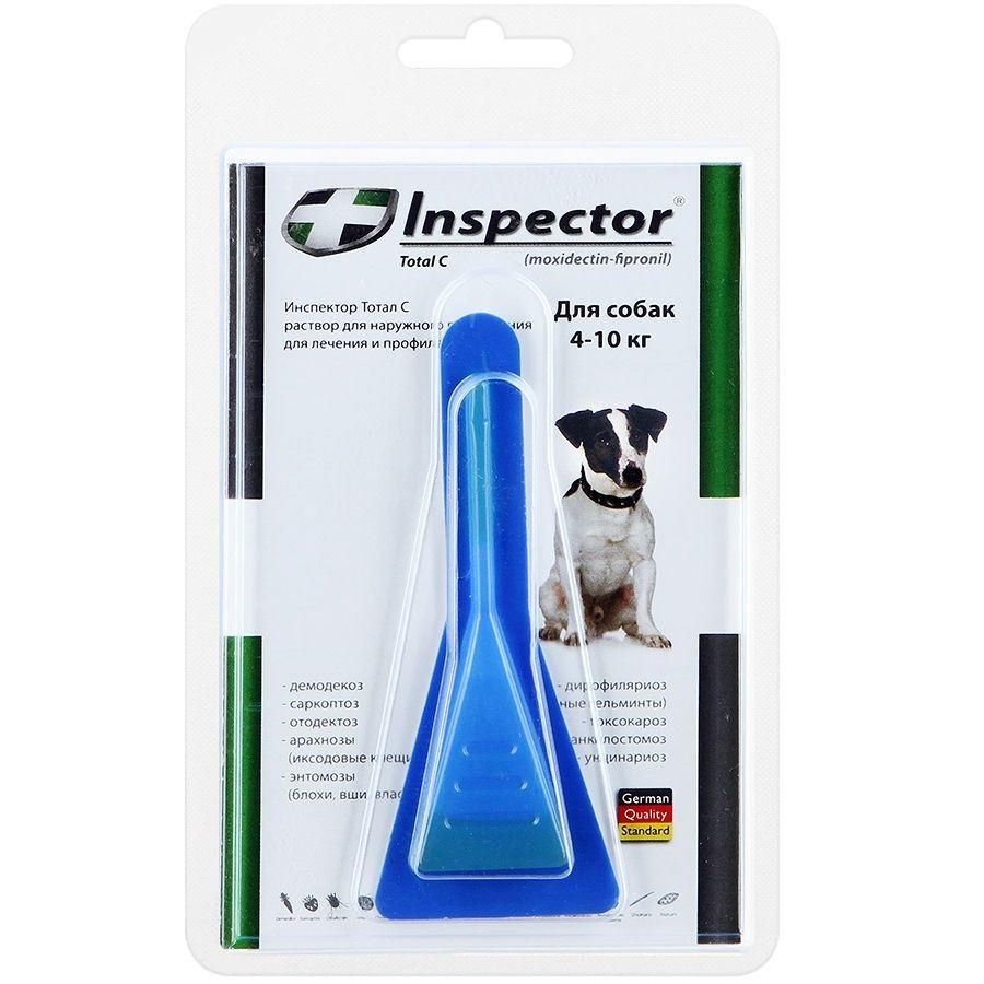 Инспектор Тотал С обладает широким спектром противопаразитарного действия, активен в отношении паразитирующих у собак демодекозных (Demodex canis), саркоптоидных (Sarcoptes canis), отдекозных (Otodectes spp.) и иксодовых (Ixodes spp.) клещей, блох (Ctenocephalides spp.), вшей (Linognathus spp.), власоедов (Trichodectes spp.), личиночных и половозрелых фаз развития кишечных нематод, включая (Тохосаra spp., Toxascaris leonina, Ancylostoma spp., Uncinaria spp., Trichuris spp.), а также личиночных форм сердечных гельминтов (Dirofilaria immitis).