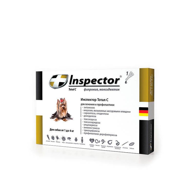 Инспектор Тотал С обладает широким спектром противопаразитарного действия, активен в отношении паразитирующих у собак демодекозных (Demodex canis), саркоптоидных (Sarcoptes canis), отдекозных (Otodectes spp.) и иксодовых (Ixodes spp.) клещей, блох (Ctenocephalides spp.), вшей (Linognathus spp.), власоедов (Trichodectes spp.), личиночных и половозрелых фаз развития кишечных нематод, включая (Тохосаra spp., Toxascaris leonina, Ancylostoma spp., Uncinaria spp., Trichuris spp.), а также личиночных форм сердечных гельминтов (Dirofilaria immitis).