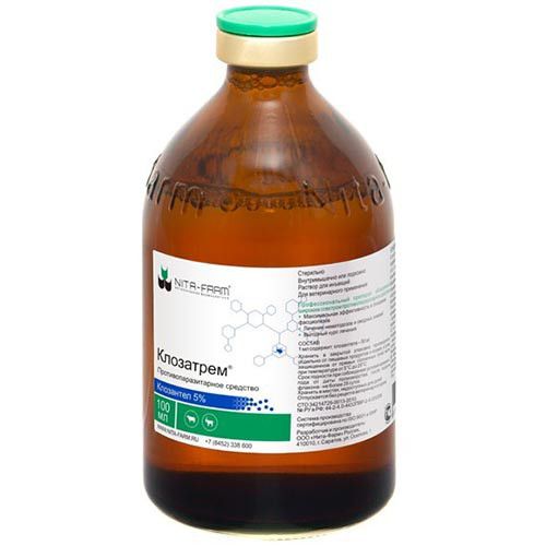 Лекарственное средство в форме раствора для инъекций, предназначенное для лечения и профилактики гельминтозов и оводовых инвазий у крупного и мелкого рогатого скота. Клозатрем® в качестве действующего вещества содержит клозантел – 50 мг/см3, а также вспомогательные компоненты. По внешнему виду лекарственное средство представляет собой прозрачную жидкость от светло-желтого до светло-коричневого цвета. Выпускают в виде стерильного раствора, расфасованным по 100 см3 в стеклянные флаконы.
