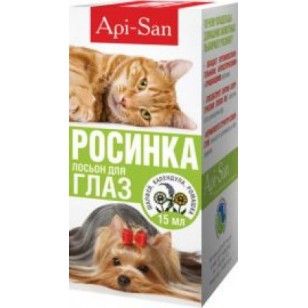 Лосьон Росинка для глаз кошки/собаки 15 мл. Экстракты ромашки, календулы, шалфея, вспомогательные компоненты. Препарат выпускается в ПЭТ флаконах-капельницах 15 мл в картонной пачке и инструкцией по применению. Гигиенический лосьон для обработки глаз животных.