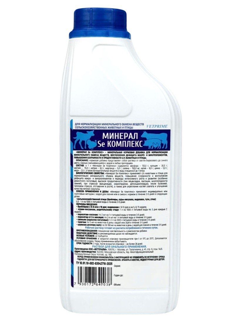 В 1л Минерал Se Комплекс содержится: фосфора 120,0 г, кальция 30,0 г, магния 15,0 г, натрия 8,0 г, марганца 5,0 г, селена 150,0 мг, калия 8,0 г, цинка 5,0 г, меди 2,5 г, а также воды очищенной - до 1л.