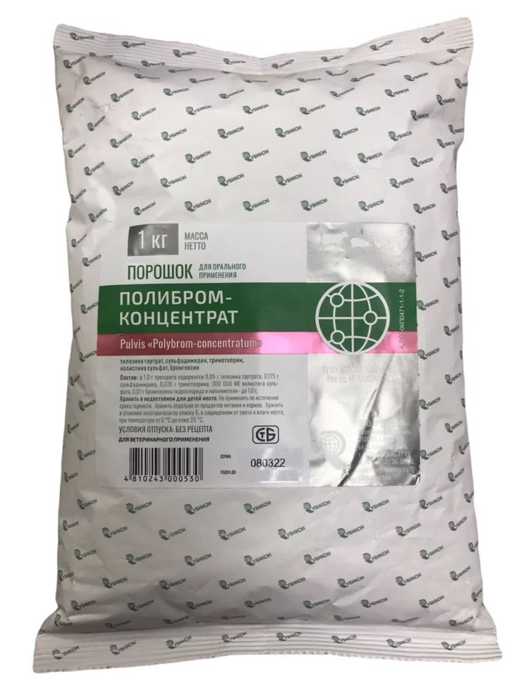 Порошок Полибром-концентрат - кристаллический порошок белого или светло-кремового цвета, хорошо растворимый в воде. В 100 г препарата содержится: 5г тилозина тартрата; 17,5г сульфадимизина; 3,5г триметоприма; 30 000 000 МЕ колистина сульфата; 1г бромгексина, декстрозы-до 100г. Препарат выпускается в пакетах из ламинированной фольги по 1; 2 кг.
