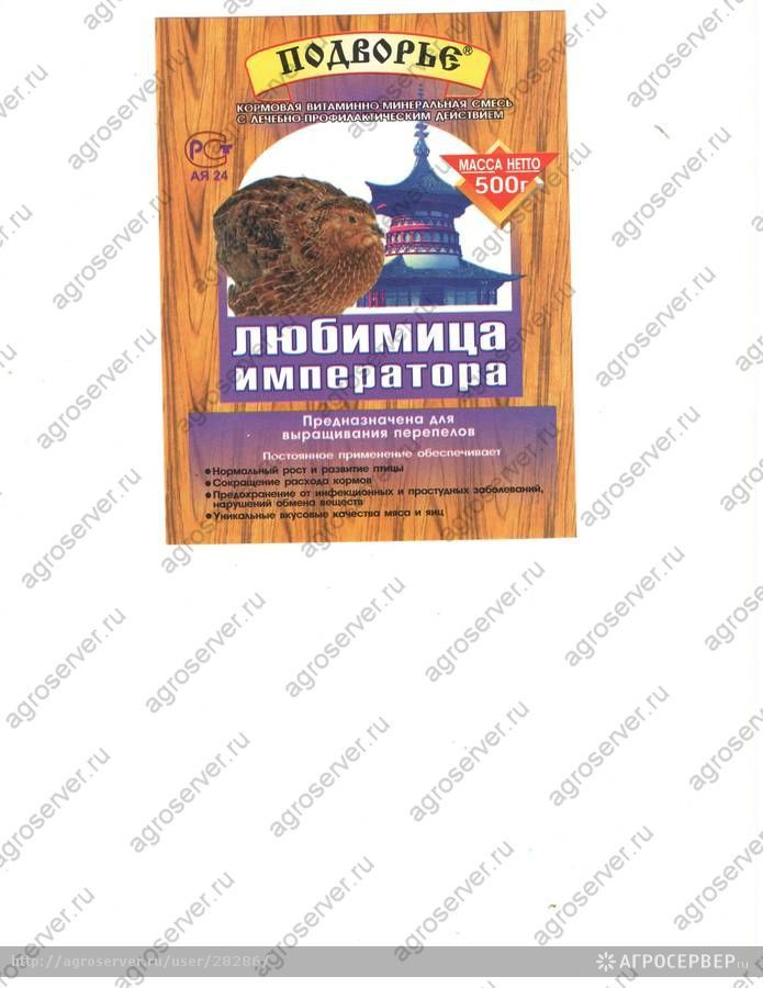 Премикс для перепелов "ЛЮБИМИЦА ИМПЕРАТОРА" предназначен для обогащения кормов перепелов, балансирования по витаминам, макро- и микроэлементам, аминокислотам. Упаковка 0,5 ― 25 кг.