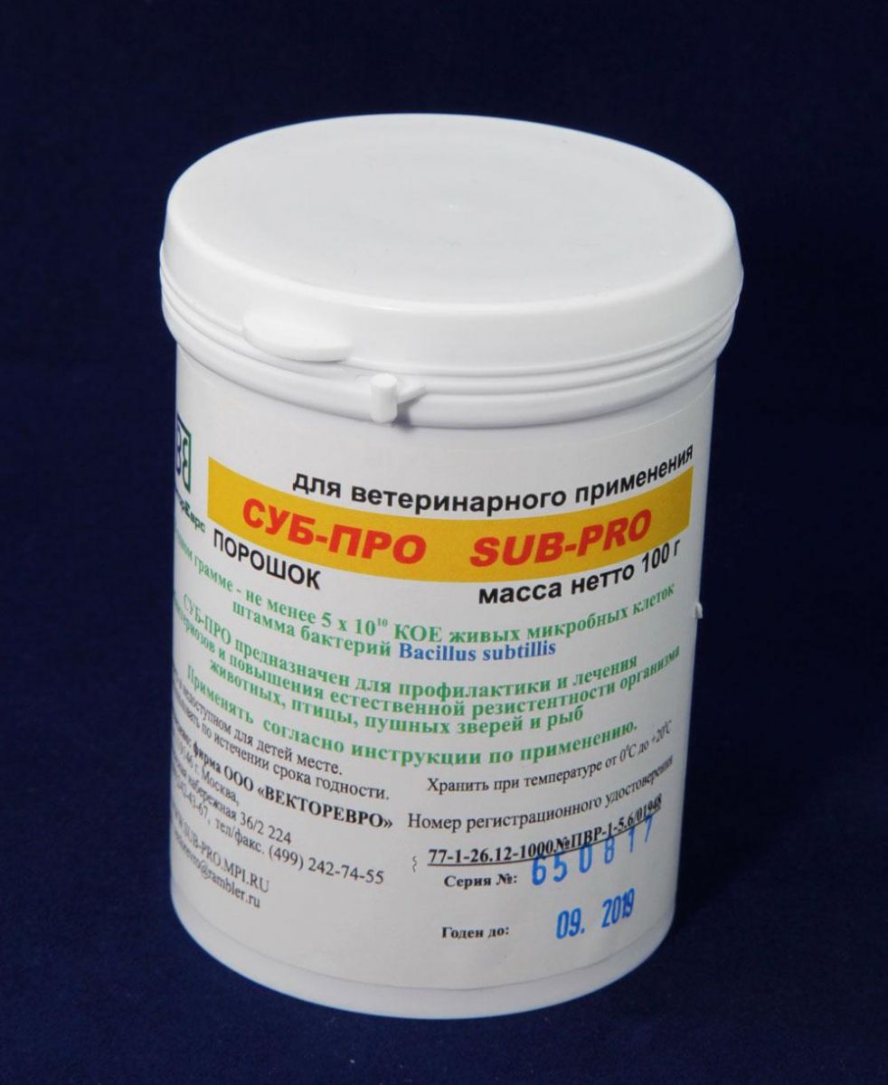 СУБ-ПРО — отличное решение для Вашего хозяйства! Это современный высокоэффективный пробиотик, приготовленный на основе штамма Bacillus subtilis ВКПМ В-2335 и предназначенный для повышения продуктивности, сохранности и естественной резистентности организма животных, а также для профилактики и лечения дисбактериозов. Культура СУБ-ПРО стимулирует рост нормальной микрофлоры кишечника животных. Бактерии Bacillus subtilis ВКПМ В-2335, входящие в состав СУБ-ПРО, являются антагонистически активными и вырабатывают антимикробные субстанции, обладающие бактериостатическим действием в отношении патогенных и условно-патогенных микроорганизмов, нормализуют качественный и количественный состав микрофлоры кишечника, активизируют пристеночное пищеварение, способствуют восстановлению популяционного уровня представителей нормальной микрофлоры кишечника.