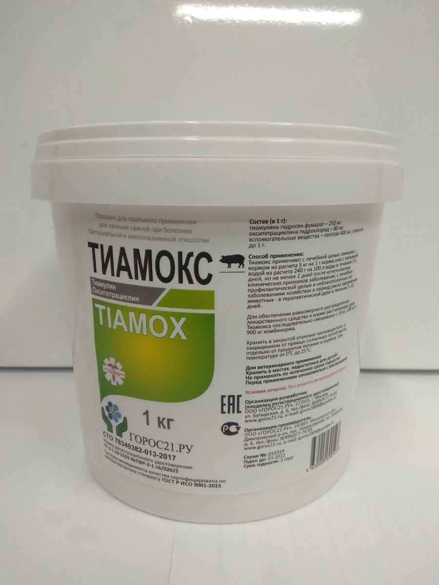 Тиамокс - применяют свиньям при бактериальных заболеваниях респираторного и желудочно-кишечного тракта: дизентерии, вызванной Treponema hyodysenteriae, энзоотической пневмонии, вызванной Mycoplasma hyopneumoniae, пастереллезе, бордетеллиозе, сальмонеллезе, колибактериозе, плевропневмонии, вызванной Actinobacillus  pleuropneumoniae и других заболеваниях.