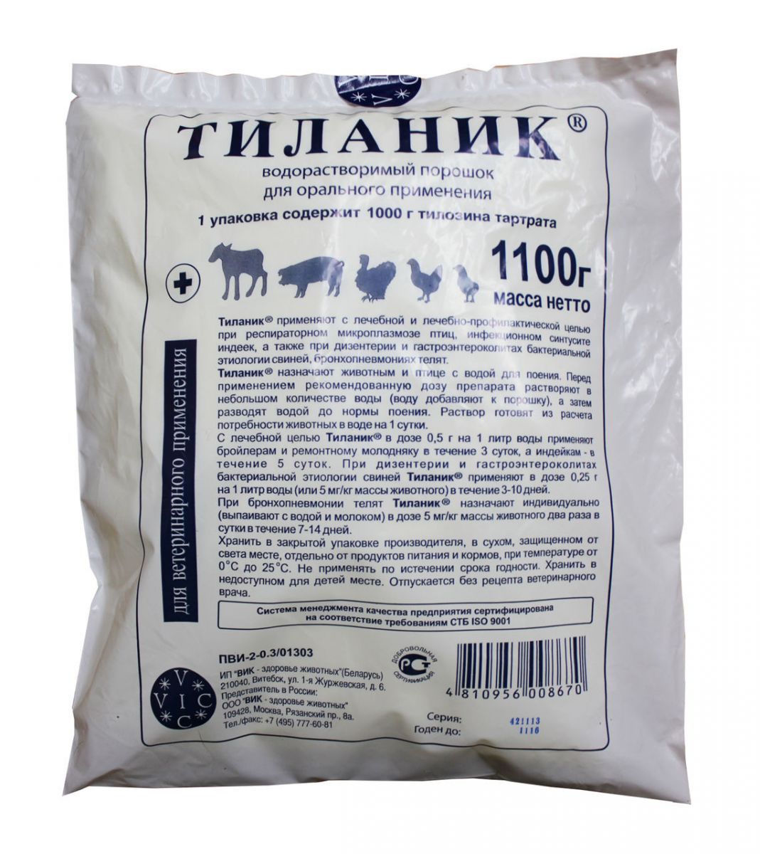 С лечебной целью Тиланик водорастворимый порошок в дозе 0.5 г на 1 л воды применяют бройлерам и ремонтному молодняку в течение 3 суток, а индейкам - в течение 5 суток.
