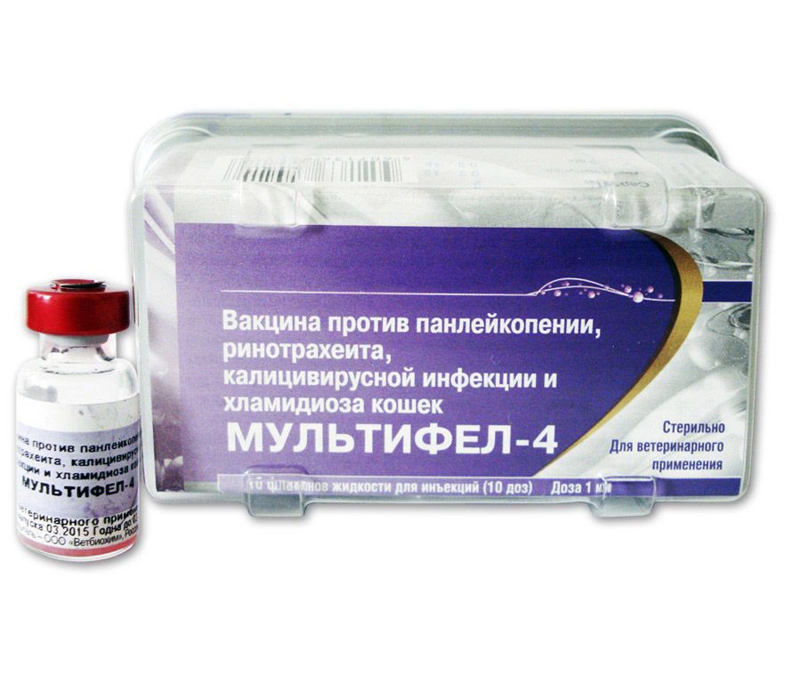 Вакцина Мультифел-4 для кошек. Инактивированные производственные штаммы вирусов панлейкопении, ринотрахеита, калицивируса и штаммов хламидий кошек и предназначена для профилактики вызываемых ими заболеваний.