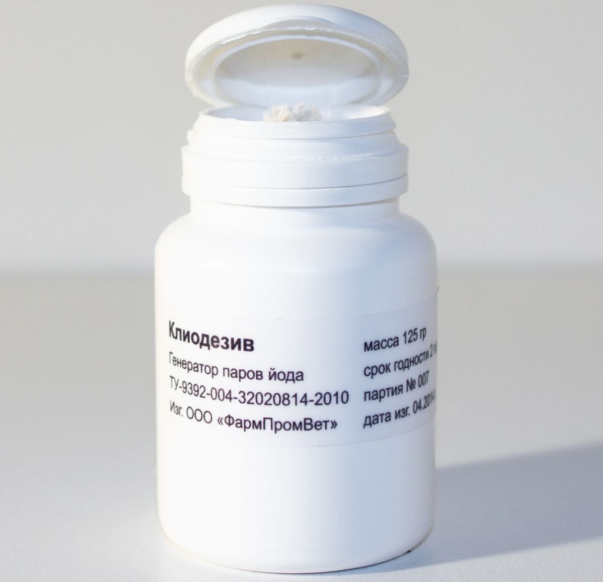 Препарат «Клиодезив» представляет собой порошок темного цвета расфасованного в полимерные флаконы (йодные шашки) по 25 гр., 50 гр. и 125 гр. Благодаря сгораемой прокладке и фитилю, легко загорается от обычной бытовой спички и др. источников огня.